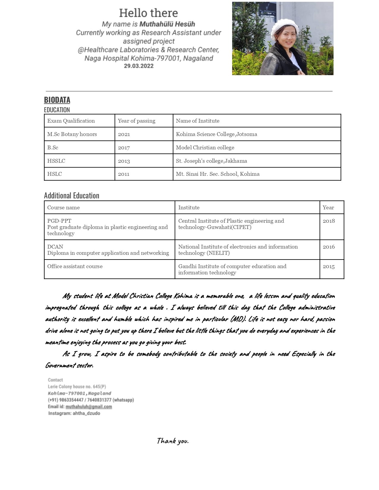 Meet ANOSE PUSA, an alumnus of MCC (BATCH OF 2012). This is what she had to say. I am Anose Pusa from Viswema village. I am a batch of 2012 and I graduated in the year 2015. My education journey in MCC was not only focused in academics but also in moral ethics and values, knowledge outside academics, personality development, self-capability study and also in spiritual belief. I am a better version of myself today and I can say that I am a proof of myself for I have seen myself growing in every aspect. I’m always thankful and grateful to MCC for nurturing and teaching me all different aspects of life lessons besides academic education. After my graduation, I worked as a part-time Chemistry lab Asst in MCC. In the year 2018, I completed my PG in dietetics and applied nutrition from Amity University, Haryana. Thereafter, I Worked as a consultant Dietitian in Sanjevani hospital, Guwahati from 19/07/2018 to 23/01/2020. Currently, I am working online (@eatrightwithAnosePusa), visit Gym, hospitals for diet consultation. In future, I’m planning to work in a hospital here in Kohima, Nagaland and also to open my own Diet Clinic. I am also planning to go for Ph.D. degree if everything goes accordingly. Today, I feel proud that MCC is proud of me for my achievements and I am super proud and happy to have made MCC proud. To the juniors of MCC - Learn and study with pleasure because what we do in pleasure, we never forget. Remember that winning doesn’t always mean being first but winning means doing better than what you’ve done before. Long Live Model Christian College.